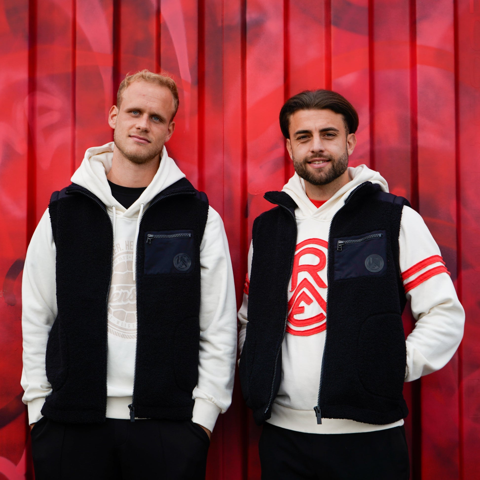 Ein besonderes Merkmal ist der Stehkragen mit appliziertem glatten Kontraststoff rund um den Hals. An die Haut selbst kommt aber nur der Teddy-Stoff, soll ja kuschelig bleiben. Außerdem bekommt ihr auf der linken Brust eine Reißverschlusstasche aus Kontraststoff mit unserem Rot-Weiss Essen Silikon-Patch, an den Seitennähten zwei große, abgesteppte Taschen und innen ein leichtes Mesh-Futter, damit die Weste atmungsaktiv bleibt.